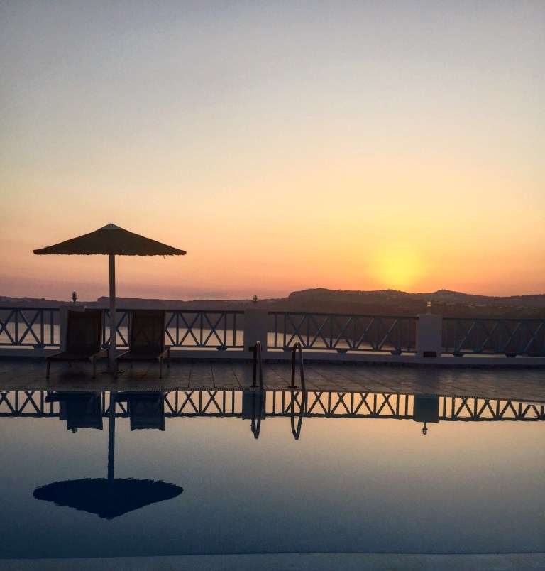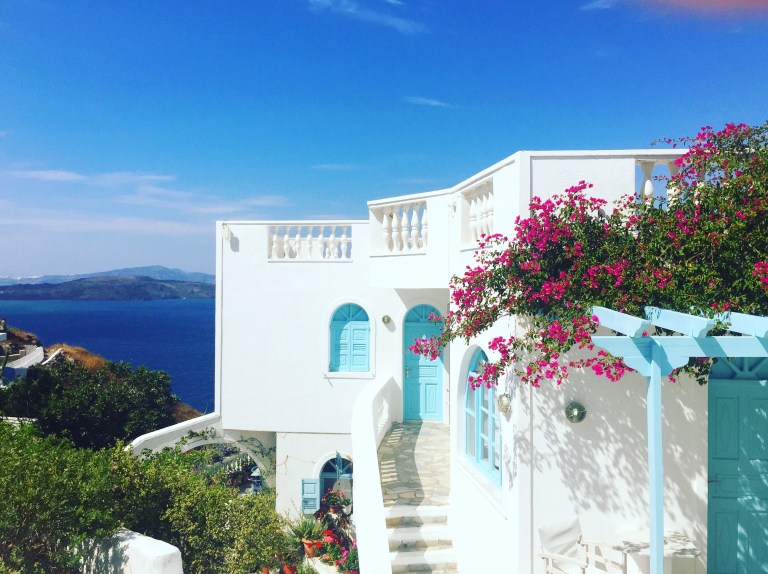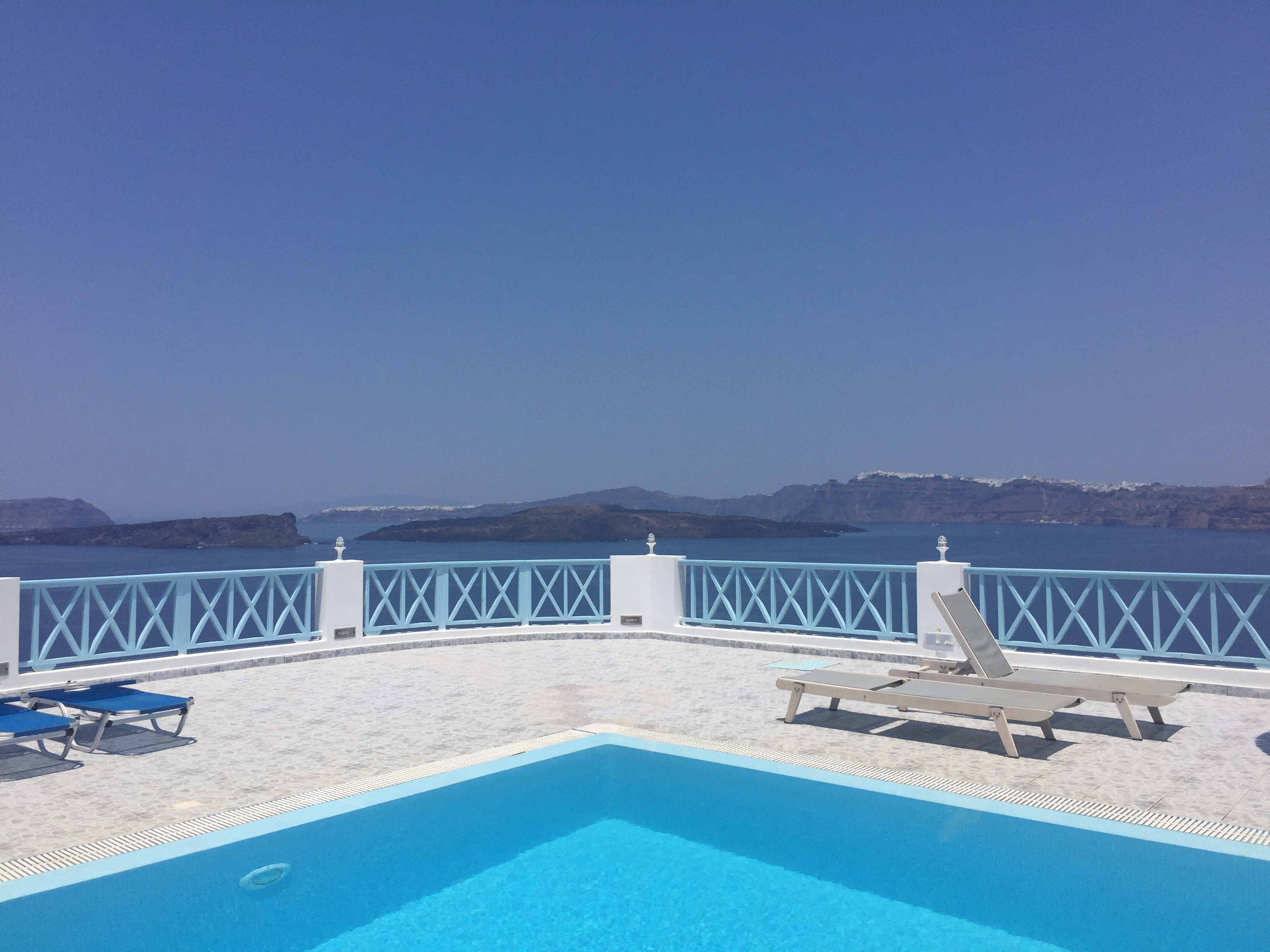 I searched long for the perfect accomodation and persistence paid off. I found Villa Maria Apartments, a gorgeous B&B in Akortiri, twenty minutes south of Fira. A quiet, quintessential blue and white building with pink boganvillia. It had the view of the Caldera (sunken volcano crater), a swimming pool with a view to die for and was close to all the beaches.
